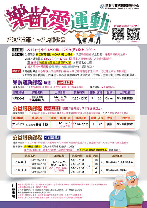 簡章線上預覽或下載請點選 ►2026年1~2月公益樂齡課程簡章
