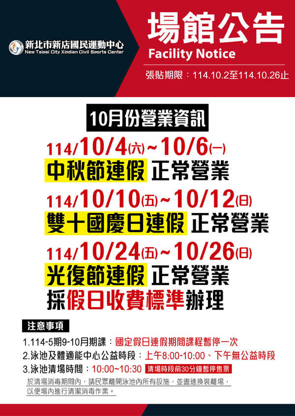 [公告] 10月份營業資訊:國定假日連假正常營業,採假日收費標準辦理。