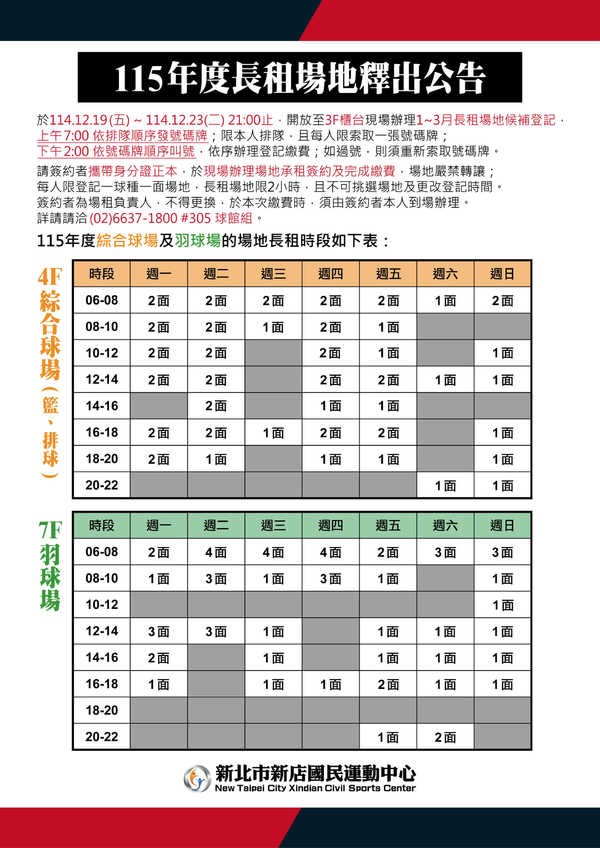 114.12.19 (五) ~ 114.12.23(二) 21:00止,開放至3F櫃台現場辦理1~3月長租場地候補登記