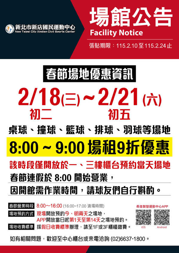 [公告] 2026春節場地優惠資訊:初二~初五 8:00~9:00 場租9折優惠