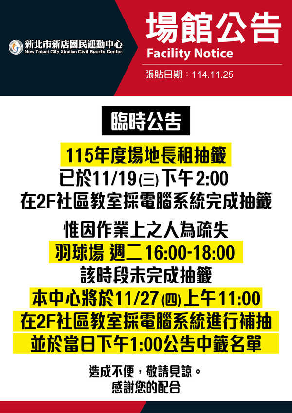 [臨時公告] 115年度場地長租抽籤:11/22下午4點將進行補抽羽球場週日20-22時段