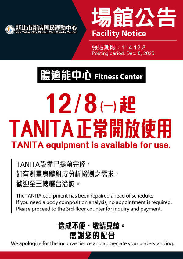 [臨時公告] 體適能中心:12/8(一) TANITA正常開放使用